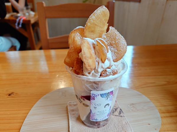 カフェトワイエでイートインするさつまいもいチップスとモンブランのパフェ