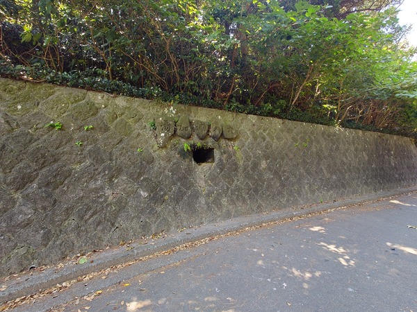 式根島を歩いていると、道路わきの壁に何やら、穴が開いてるのを見つけたんだ。その上には、看板らしき文字もあったよ。何だろ、と思って近づいてみ···