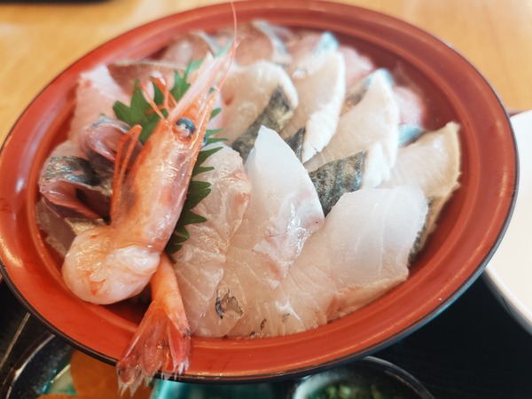 漁夫の水魚丸海鮮丼並には6種の海鮮がのっている
